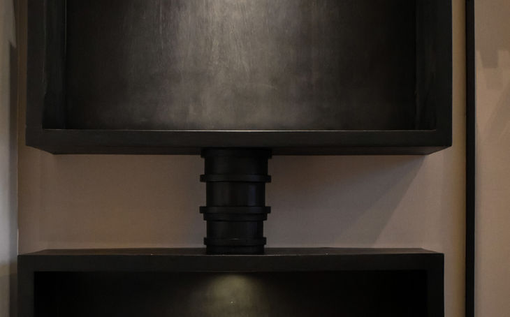 Diseñado como un altar contemporáneo, este bar evoca una piedra ceremonial. Su estructura vertical y contenida, pensada para conservar botellas y objetos de hospitalidad, adquiere un aura ritual. Aquí, el acto cotidiano de compartir se convierte en ceremonia. Las texturas oscuras y los espacios vacíos hablan de silencio, fuego y sombra.