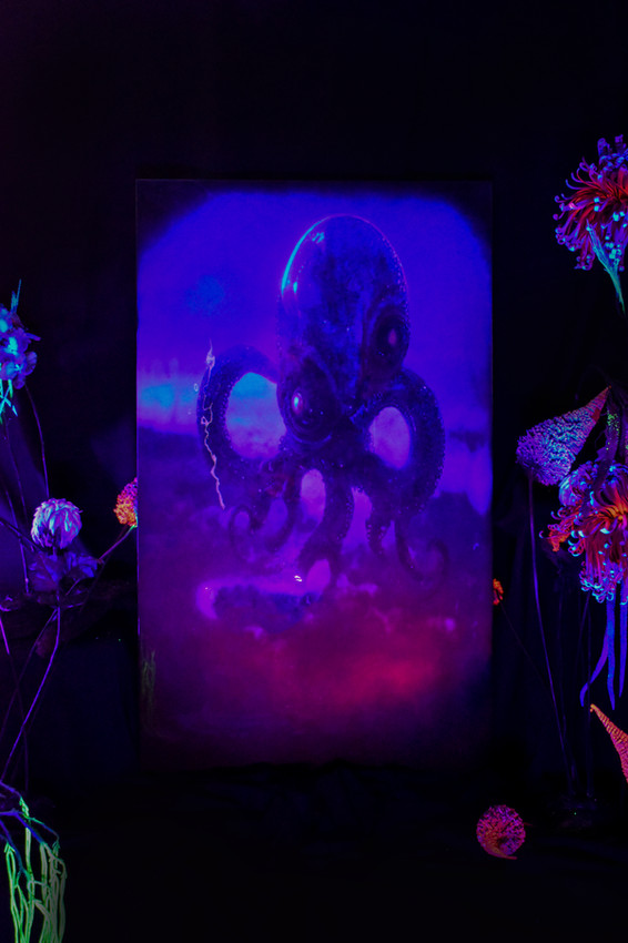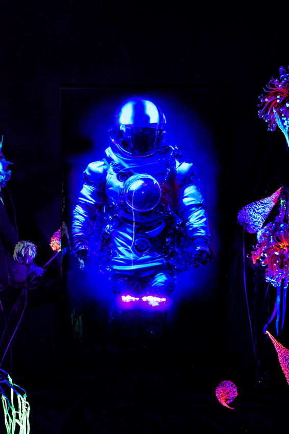 Mezclando técnicas mixtas que van desde la intervención de arte digital en gran formato , hasta empleando diferentes materiales que evocan la nueva era espacial llevándonos a un escenario museográfico en un jardín de este nuevo planeta llamado KAUS donde la luz parece dibujar colores que son parte de la obra plástica donde la fotoluminiscencia transforma la perspectiva de lo que creemos ver al reaccionar con luz ultravioleta.