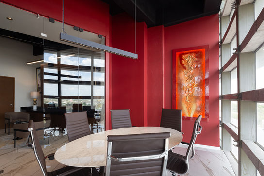 Ambas oficinas poseen una sala de juntas, cada una pintada en su color característico: azul cobalto y rojo intenso. En la sala Azul, un cuadro ilustra las burbujas del océano, mientras que en la sala Rojo, una flama evoca la pasión y el poder. Estos espacios reflejan la esencia de su color y su conexión con la naturaleza y la historia regional. Sin embargo, más allá de sus diferencias superficiales, estas oficinas comparten un hilo conductor que las une en un abrazo conceptual.